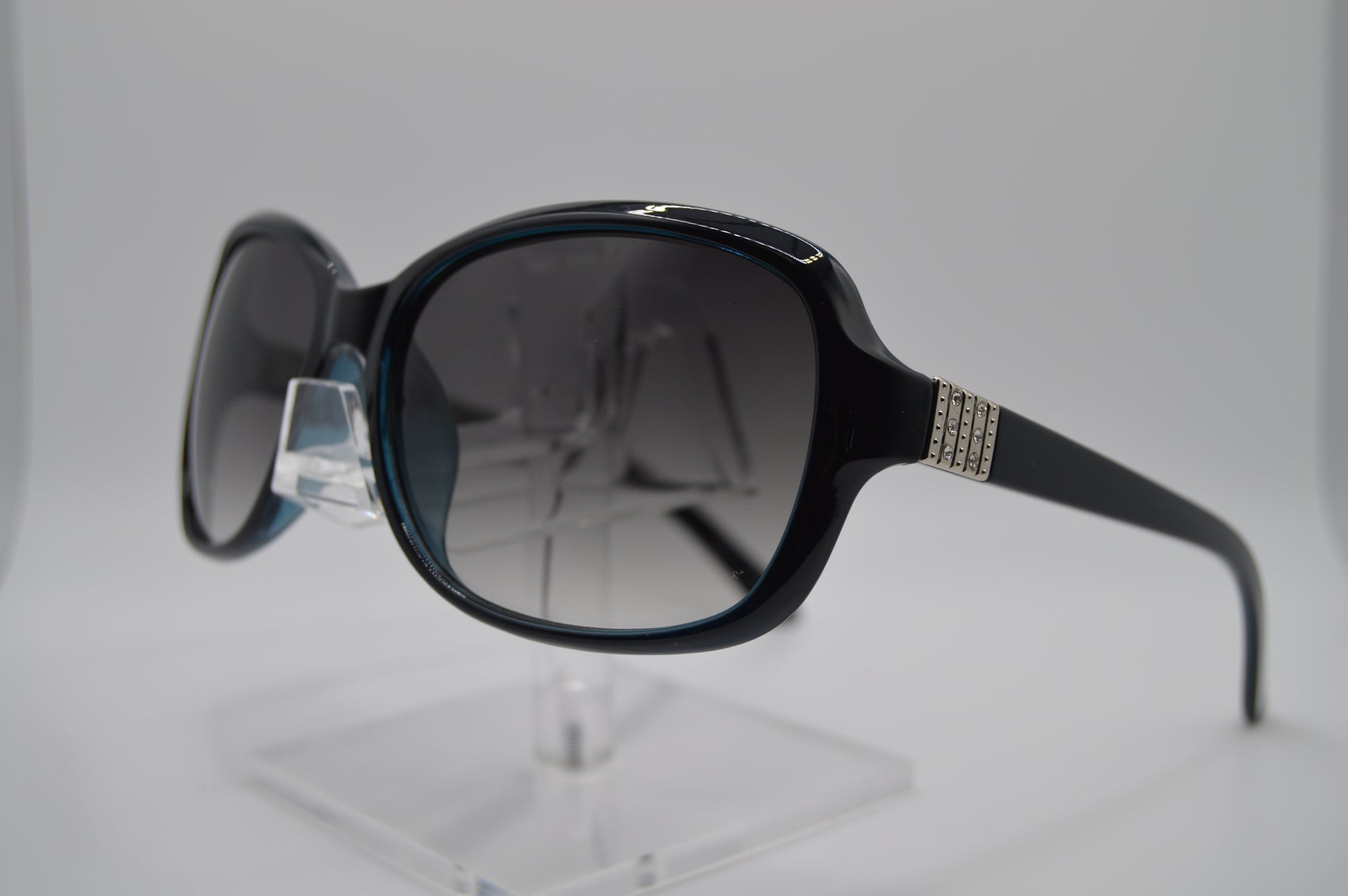 Deep blue round sunglasses with silver embellishments and gradient lenses.