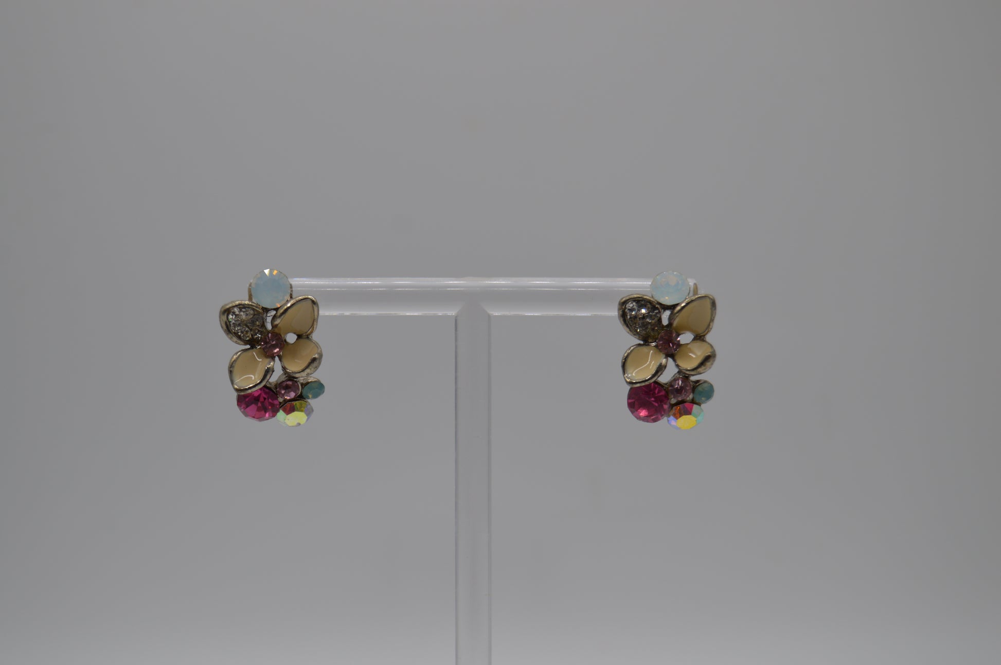 Gold-toned floral earrings with pink center stones and colorful plastic bead accents. Lightweight and full of personality.