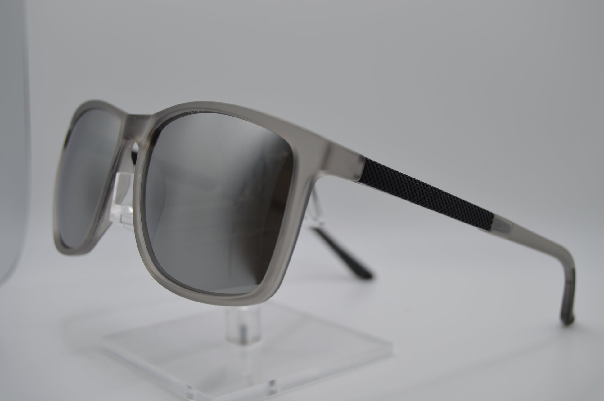 Grey sunglasses with black accents and silver reflective lenses
