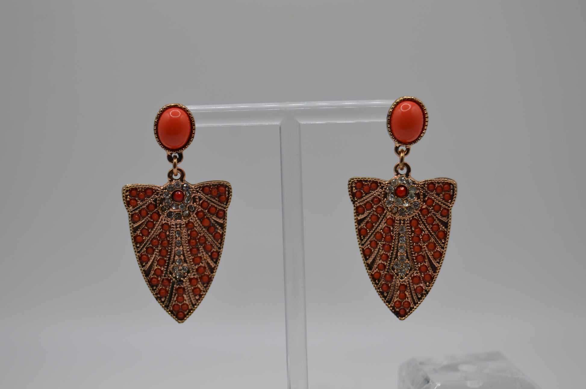 Bold and elegant, these handcrafted earrings feature shield-shaped pendants with red-orange plastic beads. A vintage-inspired design perfect for standout occasions.