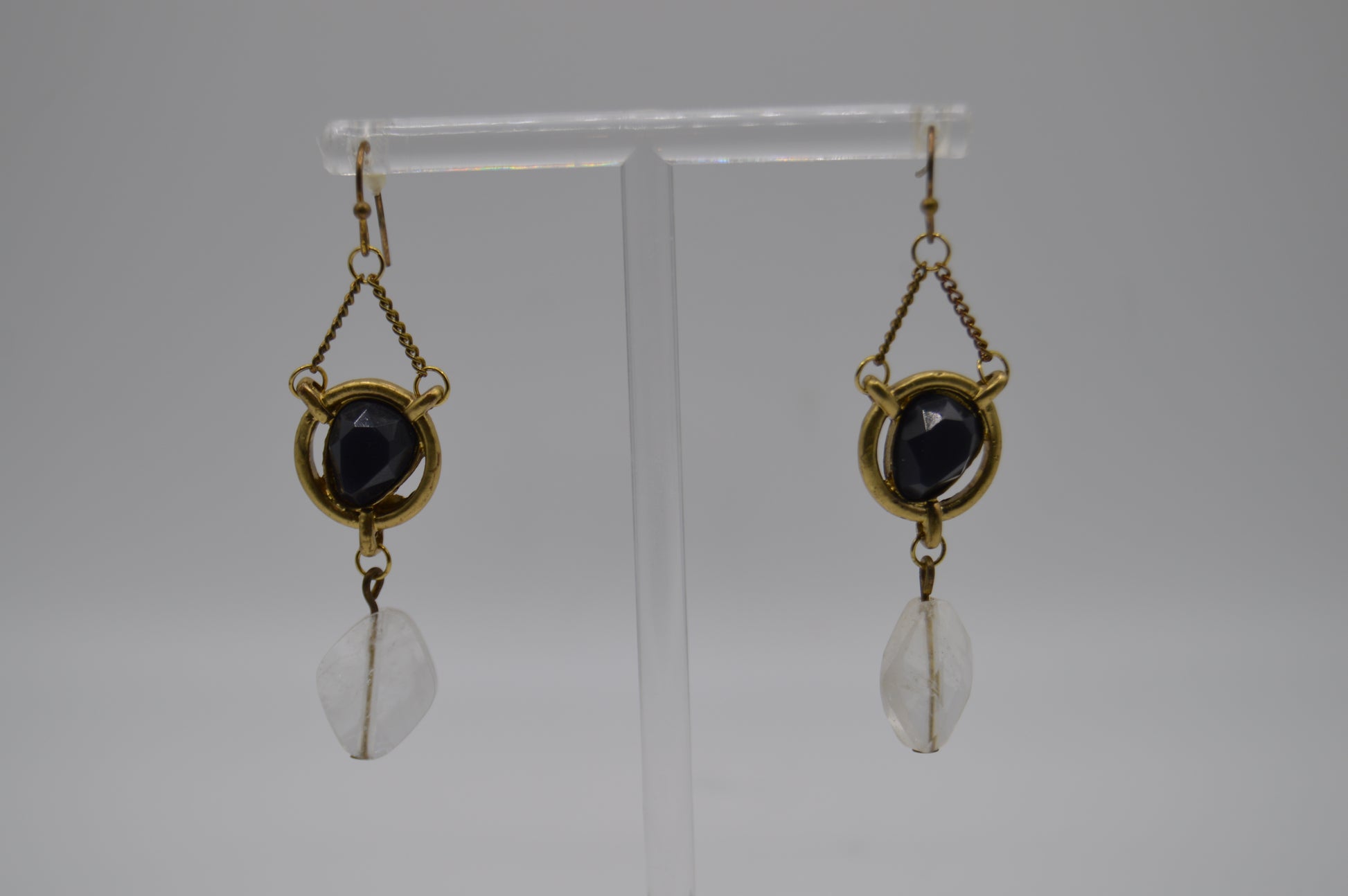 With gold-toned frames, these lightweight earrings feature faceted black and translucent white plastic accent stones for a bold yet elegant look. Comfortable to wear and versatile, they add a touch of vintage charm to any outfit